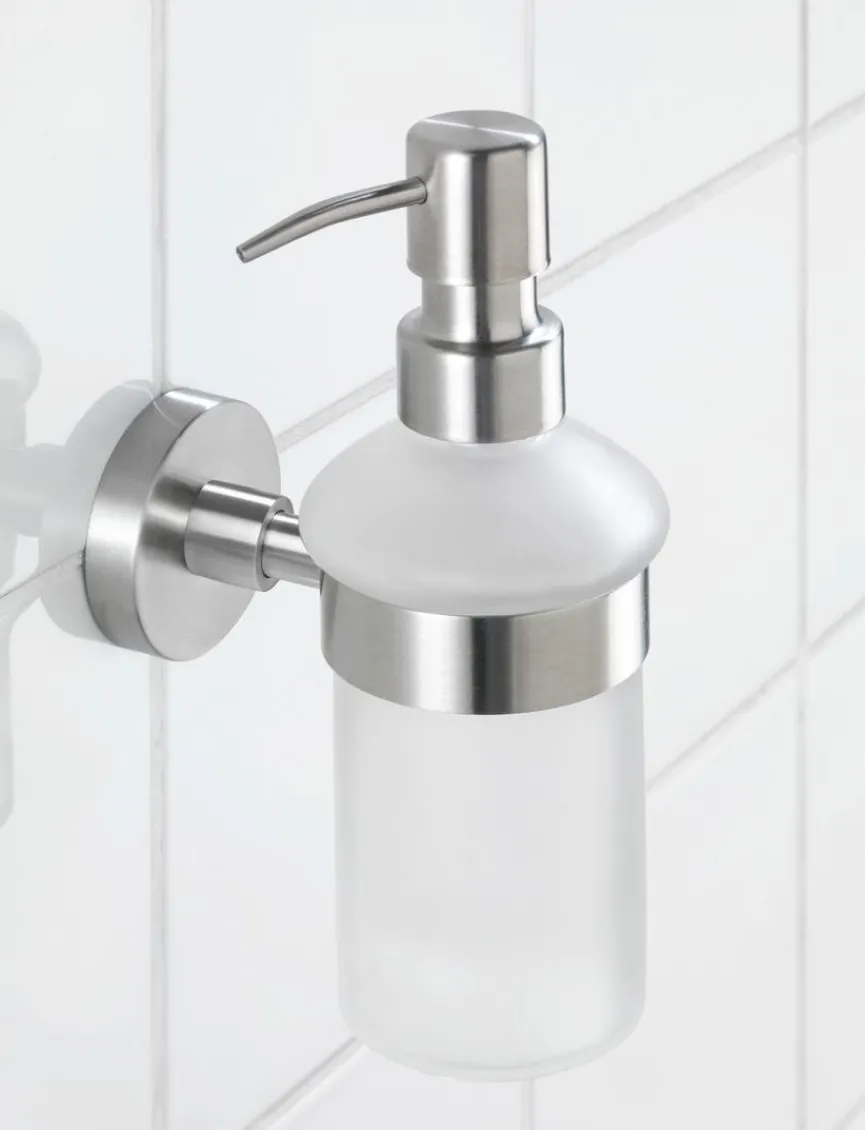 Flüssigseifen und Waschlotionen lassen sich im WENKO Seifenspender Bosio auf eine sehr attraktive Art aufbewahren. Der praktische Pumpspender ermöglicht ein einfaches und genaues Dosieren. Mit seiner Halterung aus rostfreiem Edelstahl und dem Behälter aus satiniertem Glas ist der Seifenspender Bosio von WENKO zudem ein sehr hochwertiges Badaccessoire.
