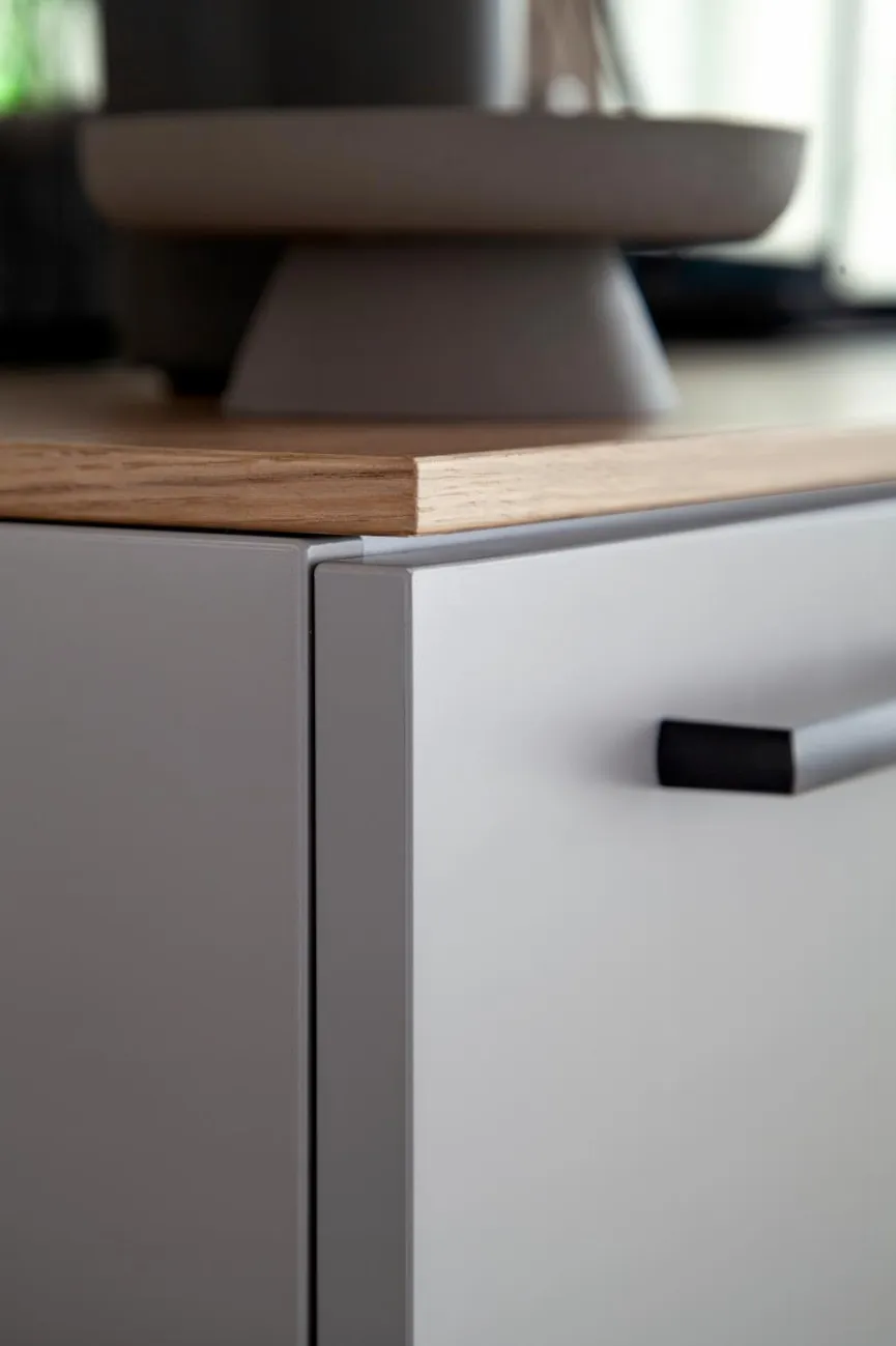 - Korpus und Front aus Holzwerkstoff (Spanplatte) mit Lack grau