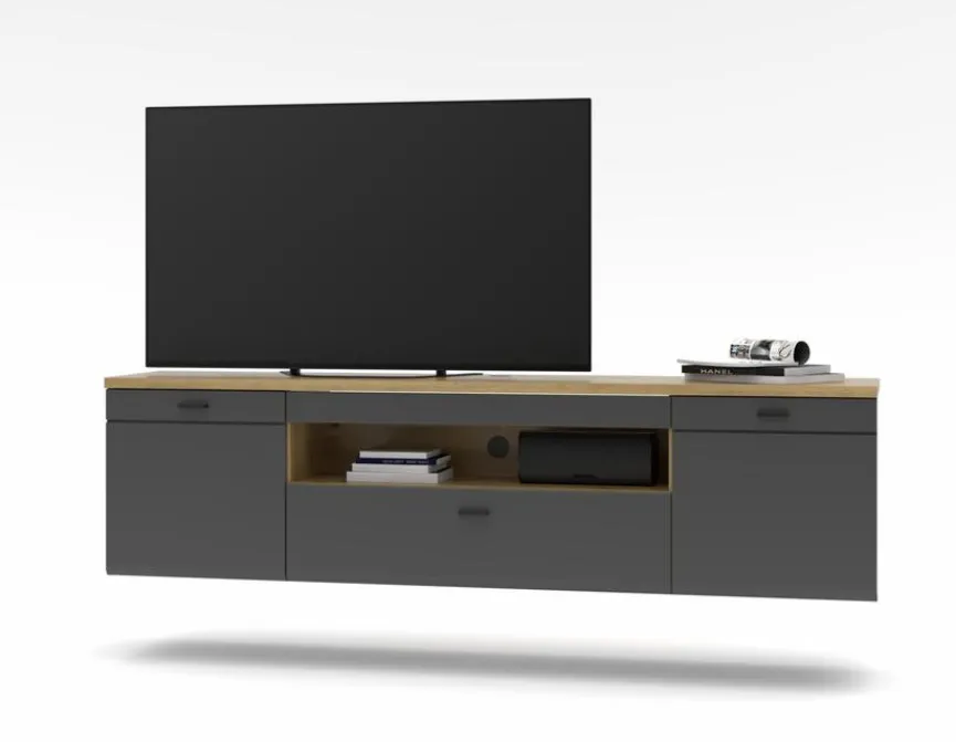 - Front aus Holzwerkstoff (MDF) in Graphit supermatt, Korpus aus Holzwerkstoff in Graphit bzw. Artisan Eiche, Absatz aus Holzwerkstoff (MDF) in Artisan Eiche Leistenoptik