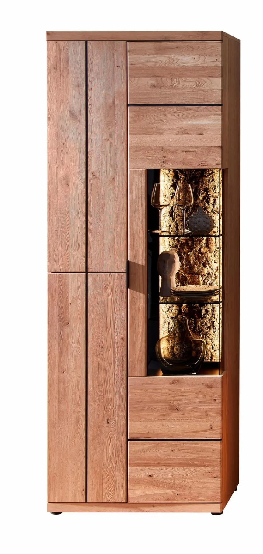 - Front aus massiver Wildeiche Bianco in gebürstet, Korpus außen aus Echtholzfurnier in Wildeiche Bianco und innen Nachbildung