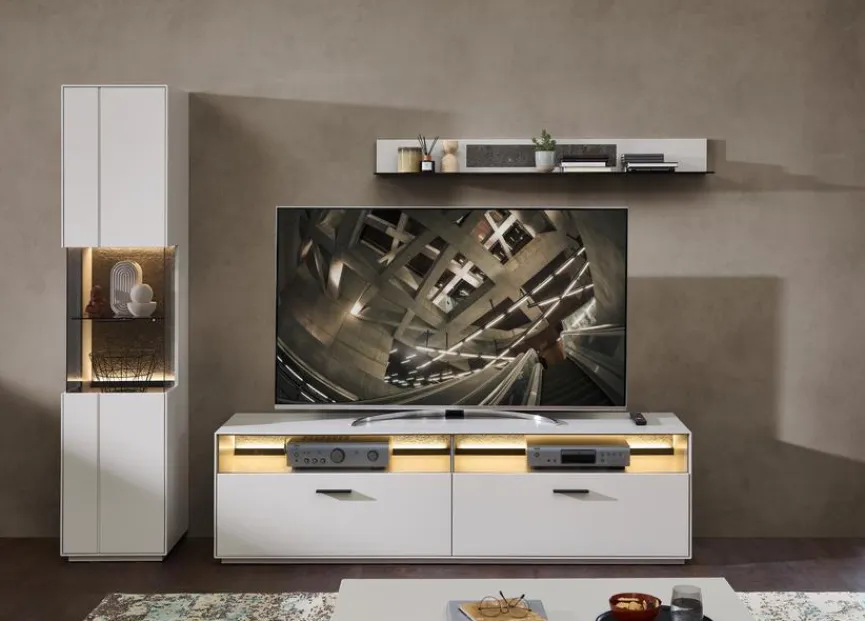 - Wohnwand besteht aus Vitrine, TV-Unterteil und Wandboard