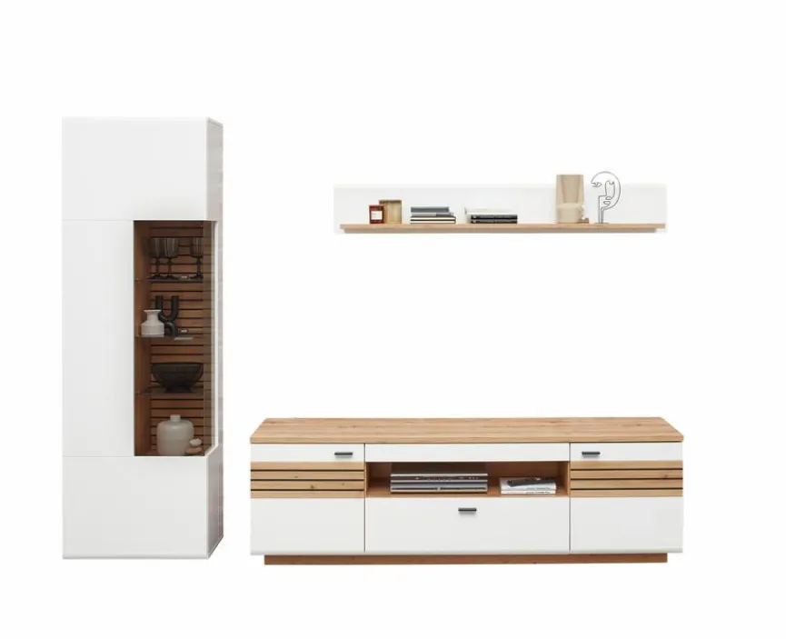 - Wohnwand besteht aus: Vitrine, TV-Lowboard und Wandboard