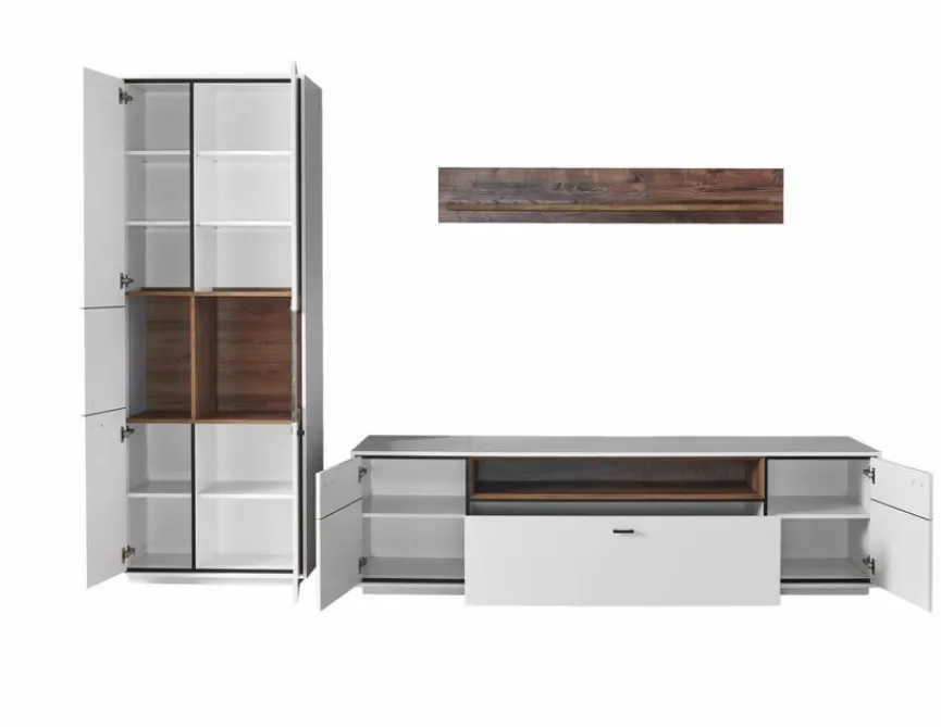 - Wohnwand bestehend aus Vitrine, Wandboard und TV-Lowboard