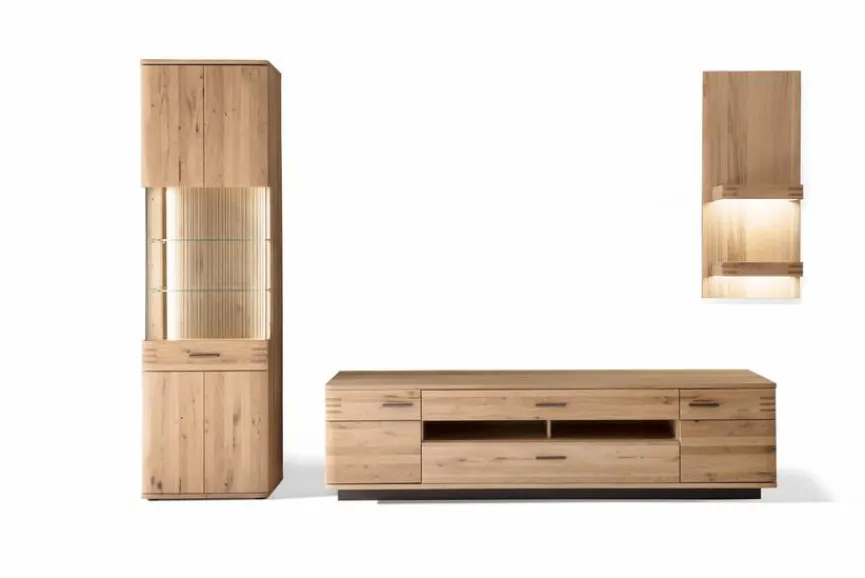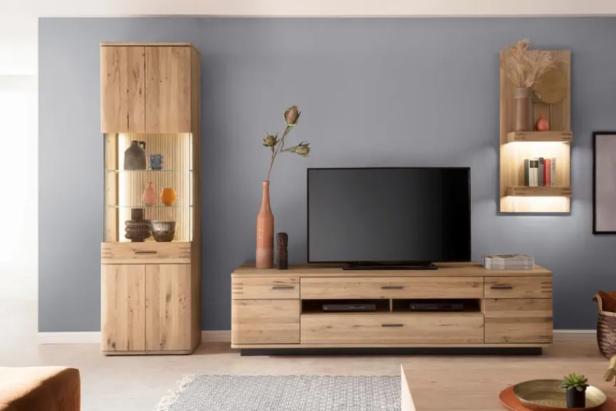 Die Wohnwand Salvador aus der gleichnamigen Kollektion bietet Ihnen eine Vollausstattung in hochwertiger Balkeneiche für Ihren Wohnraum. Die Holzmaserung kreiert in Ihrem Raum ein besonders natürliches und wohnliches Flair, während das Design die Modernität und die Eleganz Ihrer Einrichtung unterstreicht. Nutzen Sie die Wohnwand Salvador für Ihren Innenbereich als Basis für Stil und Funktionalität.