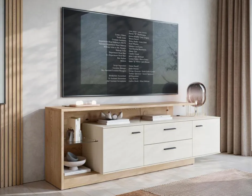 Ein echter Hingucker für jede Lounge oder jedes Wohnzimmer ist das schmucke TV-Lowboard Meolo des Herstellers Wójcik. Dieser TV-Unterschrank im Echtholz-Look sieht nicht nur wunderschön aus, sondern ist zudem auch noch überaus praktisch. Das TV-Lowboard Meolo bietet eine großzügige Stellfläche für Ihren Fernseher und außerdem jede Menge Platz und Stauraum für andere Geräte und Zubehör.