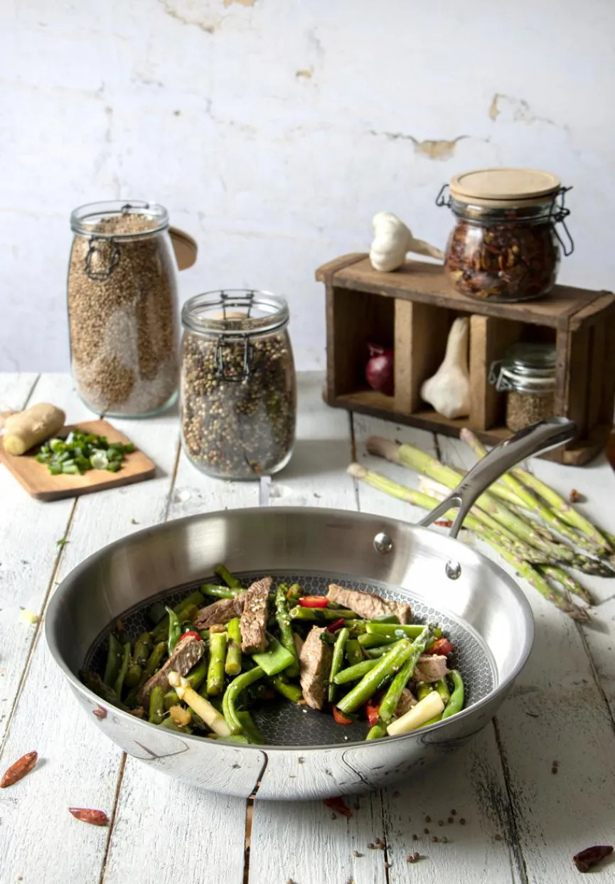 Mit der Wokpfanne Relief Evolution Ø 30 cm von ELO lassen sich auch zu Hause stilecht asiatische Gerichte zubereiten, denn die charakteristische Form ermöglicht es, die traditionelle Zubereitungsweise nachzuahmen. Hitzebeständiger Edelstahl, ergänzt durch eine PFAS-freie Antihaftbeschichtung, garantiert eine einfache Handhabung bei einem optimalen Bratergebnis. Lassen Sie Ihrer Kreativität freien Lauf und entdecken Sie mit der Wokpfanne Relief Evolution Ø 30 cm den Geschmack fernöstlicher Cuisine.