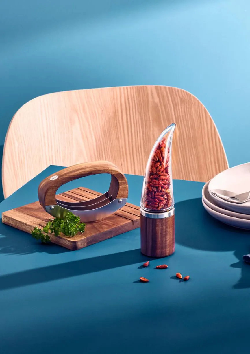 Wer das Wiegemesser RoccaVerde 2tlg. von AdHoc zum Zerkleinern von Nüssen, Schokolade, Kräutern und Co. einsetzt, kann sich über gleichmäßige Resultate freuen. Dank der Anordnung der scharfen Klingen steht das stilvoll aussehende Küchenwerkzeug sicher, und das Schneidbrett stellt bei Nichtgebrauch dank der feinen Rillen eine komfortable Abstellmöglichkeit dar. Nach der Benutzung kann das Wiegemesser RoccaVerde 2tlg. von Hand gereinigt werden.