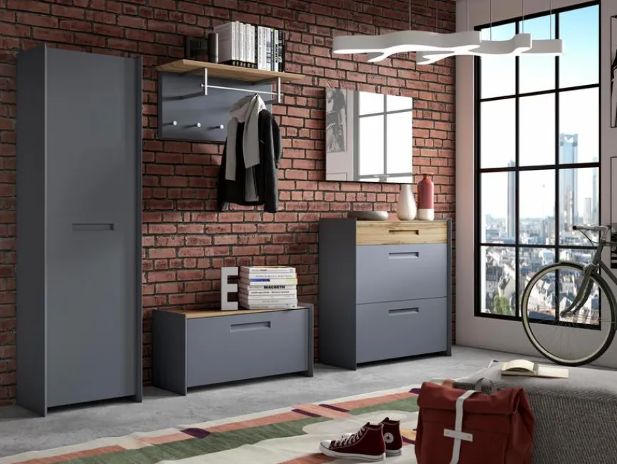 - Garderobe aus Stand-Mehrzweckschrank, Garderobenbank, Wandgarderobe, Stand-Schuhschrank und Spiegel