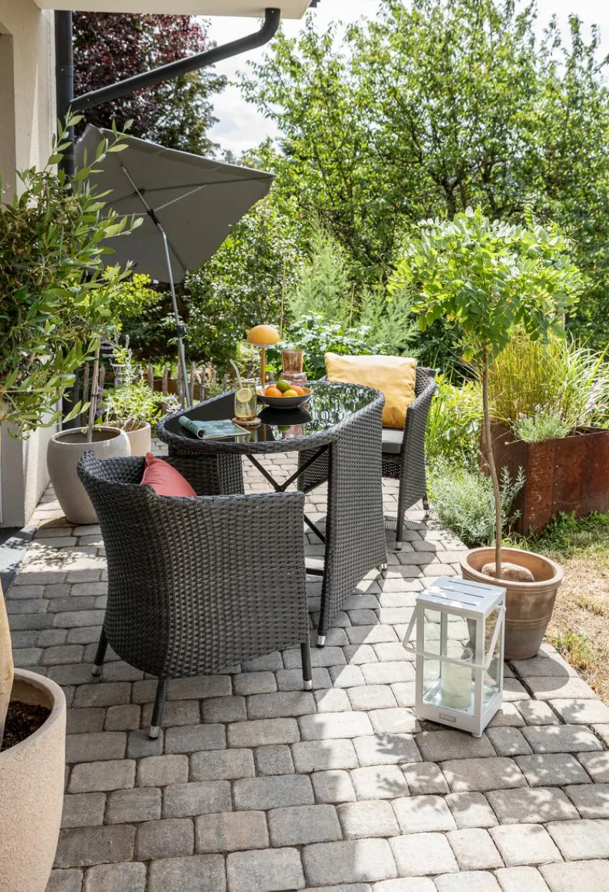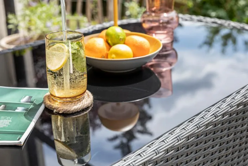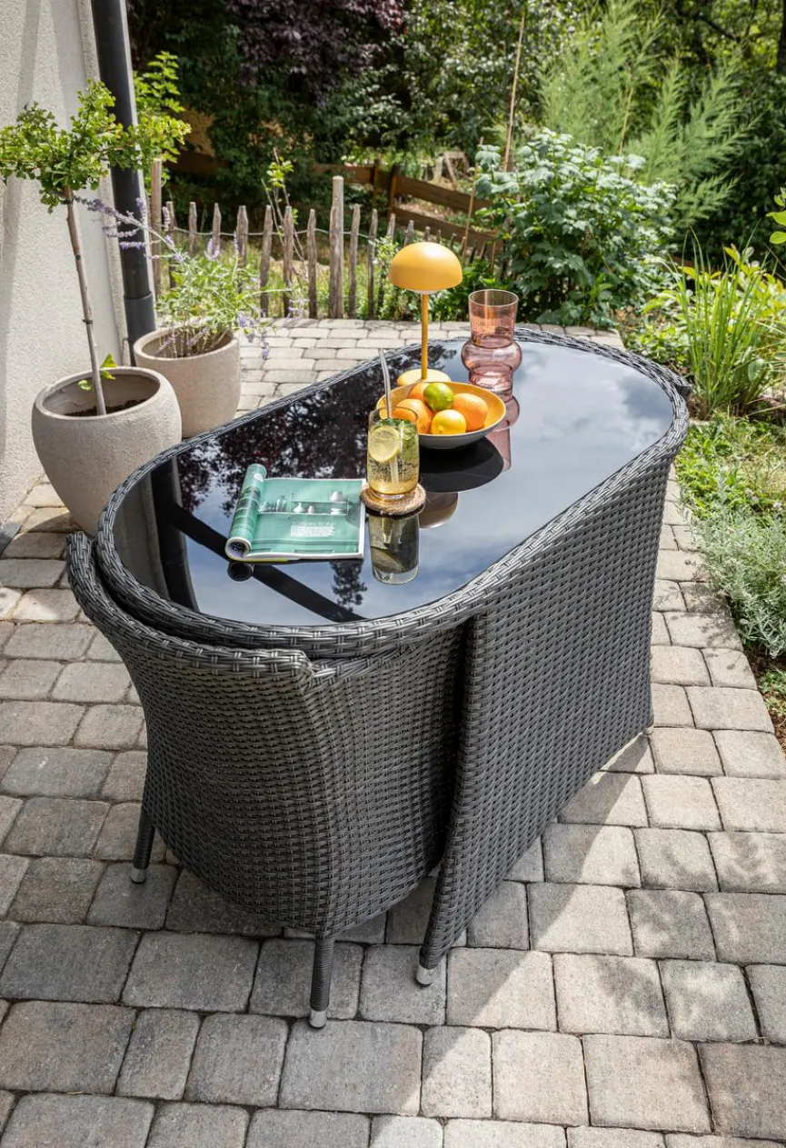- Stühle lassen sich platzsparend mit dem Tisch zusammenschieben