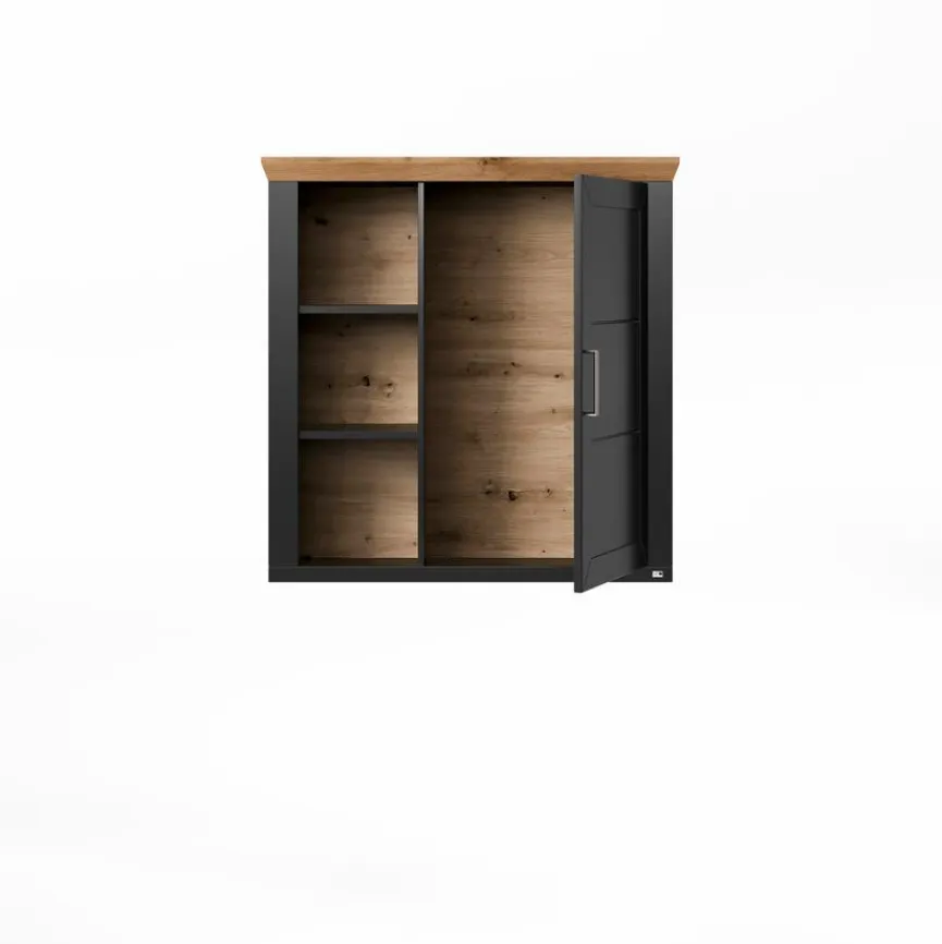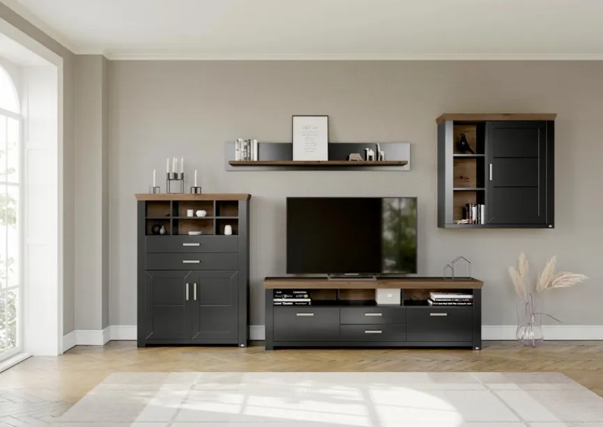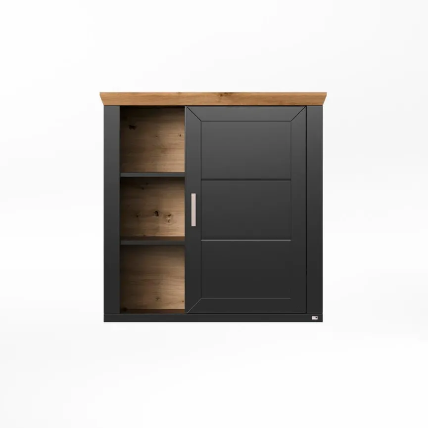 - Front aus Holzwerkstoff (MDF) in Graphit, Korpus aus Spanplatte mit kratzfester Melaminharzfolie in Graphit, Absetzung in Artisan Eiche Dekor