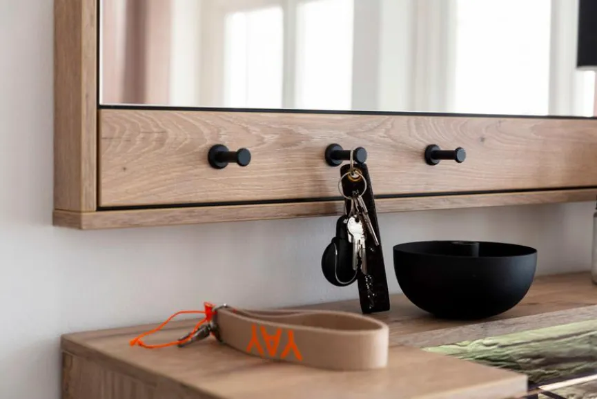 Ganz egal, ob alleine oder als Element des Garderobensets der MCA-Designserie – der Spiegel Mezzano hat an jeder Wand eine freundliche und warme Ausstrahlung. Er ist in jedem Flur eine stilvolle Lösung für den letzten schnellen Outfit-Check, bevor Sie das Haus verlassen. Äußerst praktisch sind die drei Metallhaken am Spiegel Mezzano, an denen Sie zum Beispiel Haus- und Autoschlüssel immer griffbereit aufbewahren können.
