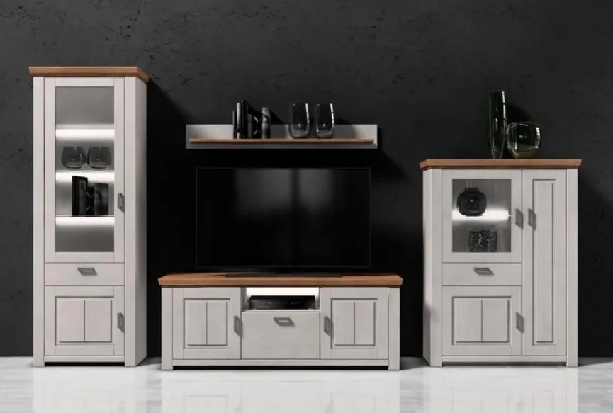 - Front und Türen bestehen aus Holzwerkstoff (Spanplatte) mit MDF Folie tiefgezogen, in der Ausführung Pino Aurelio