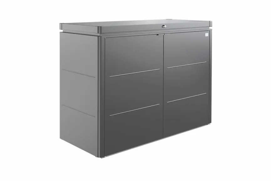 Das Garten-Highboard 160 cm aus dem Hause Biohort bietet Ihnen viel Platz für Gartengeräte, Sitzauflagen, Pflanzutensilien und weitere Dinge. Der Gartenschrank lässt sich nach oben öffnen. Daneben ermöglichen zwei große Türen im vorderen Bereich einen komfortablen Zugriff auf die im Garten-Highboard 160 cm untergebrachten Gegenstände.