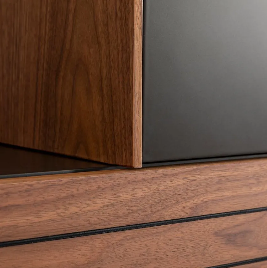 - Aus Holzwerkstoff mit Lack in anthrazit, Absetzungen aus Holzwerkstoff mit Echtholzfurnier in Nussbaum, untere Abdeckplatte des TV-Lowboards mit Echtholzfurnier in Nussbaum, Hängeelement mit Lamellenrückwand
