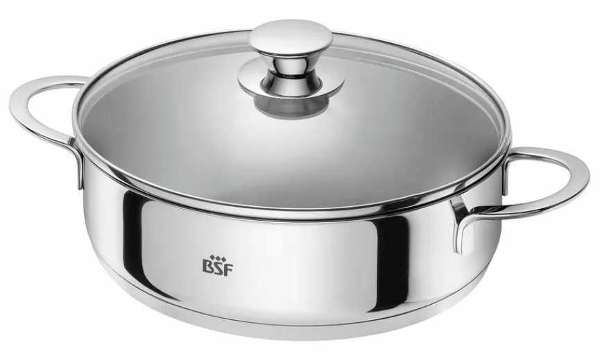 Mit der Servierpfanne Bordeaux Ø 28 cm von BSF sind Hobbyköche bestens ausgestattet. In der Pfanne mit Glasdeckel und integrierter Skala zum Abmessen der Füllmenge gelingt das Schmoren und Braten von Fleisch und Gemüse hervorragend. Ein besonderer Vorzug der Servierpfanne Bordeaux Ø 28 cm ist die Verwendbarkeit auf allen Arten von Kochplatten, einschließlich des Induktionskochfelds.