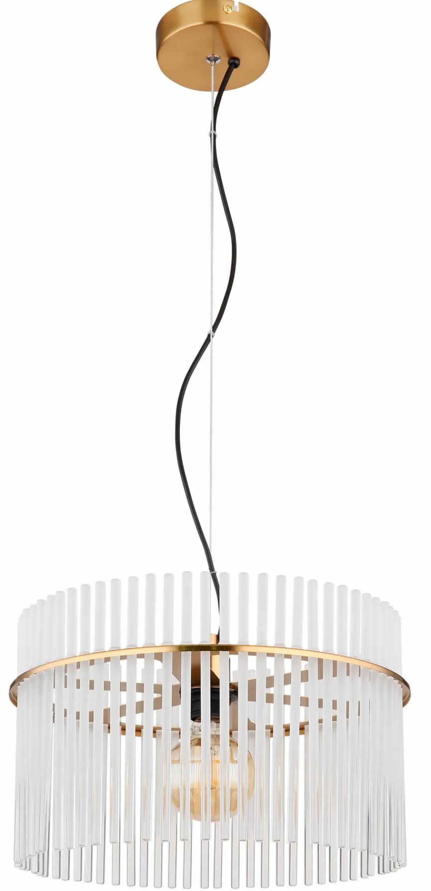 Die Pendelleuchte Gorley von Globo besticht durch außergewöhnliches Design, das Elemente des Art Déco modern interpretiert. Elegant angeordnete, zarte Glasstäbe brechen die Lichtstrahlen und kreieren bei dieser edlen Pendellampe ein faszinierendes Spiel aus Licht und Schatten. Durch die Kombination mit einem Korpus aus mattem, goldfarbenen Metall avanciert die Pendelleuchte Gorley zu einem exklusiven Style-Highlight, das Ihrem Ambiente einen luxuriösen Touch verleiht.