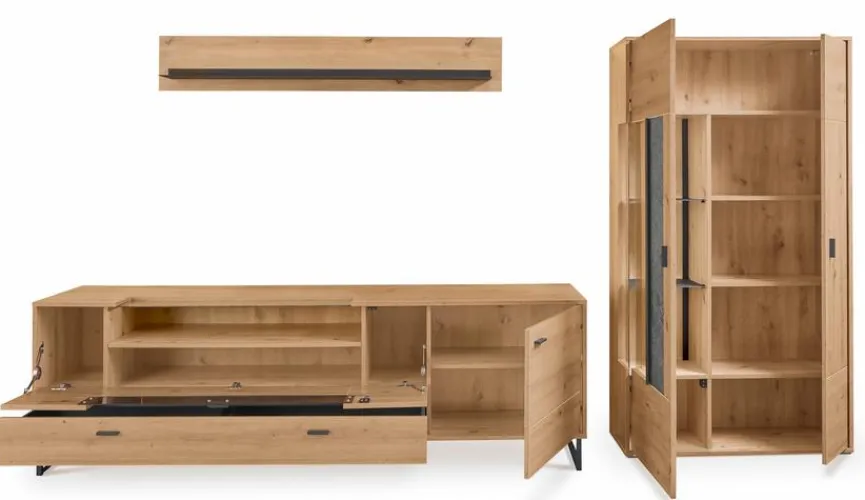 - Bestehend aus Vitrine, TV-Lowboard und Wandboard