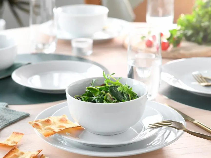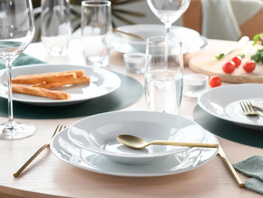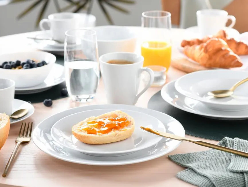 - Je 4 Speiseteller Ø 27 cm, Suppenteller Ø 22 cm, Frühstücksteller Ø 20,5 cm, Kaffeebecher 300 ml, Müslischalen Ø 14 cm