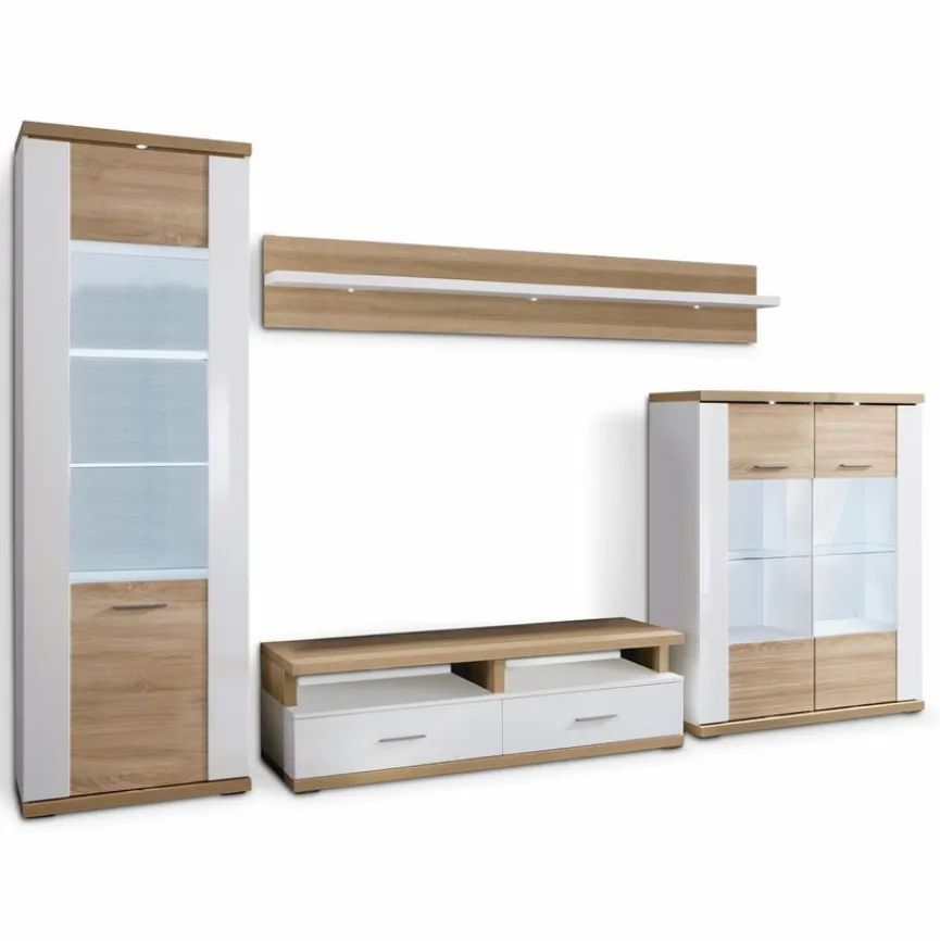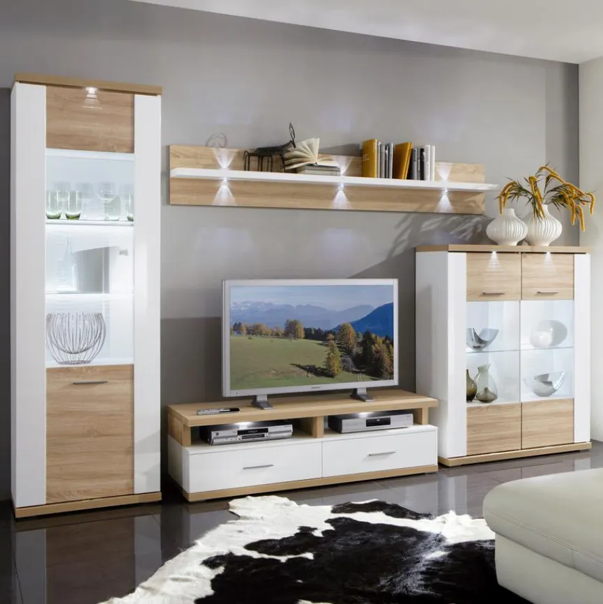 - Wohnwand aus Vitrine, TV-Lowboard mit TV-Aufsatz, Wandboard und Highboard