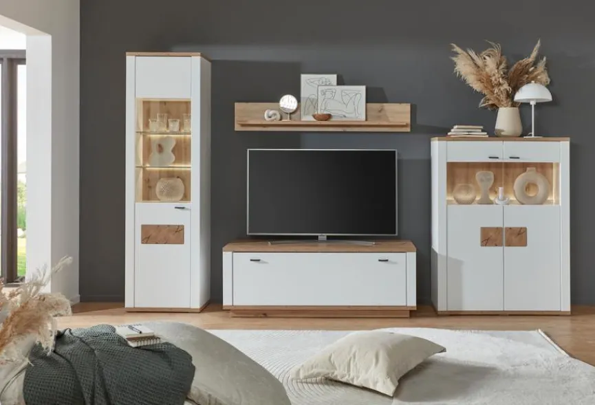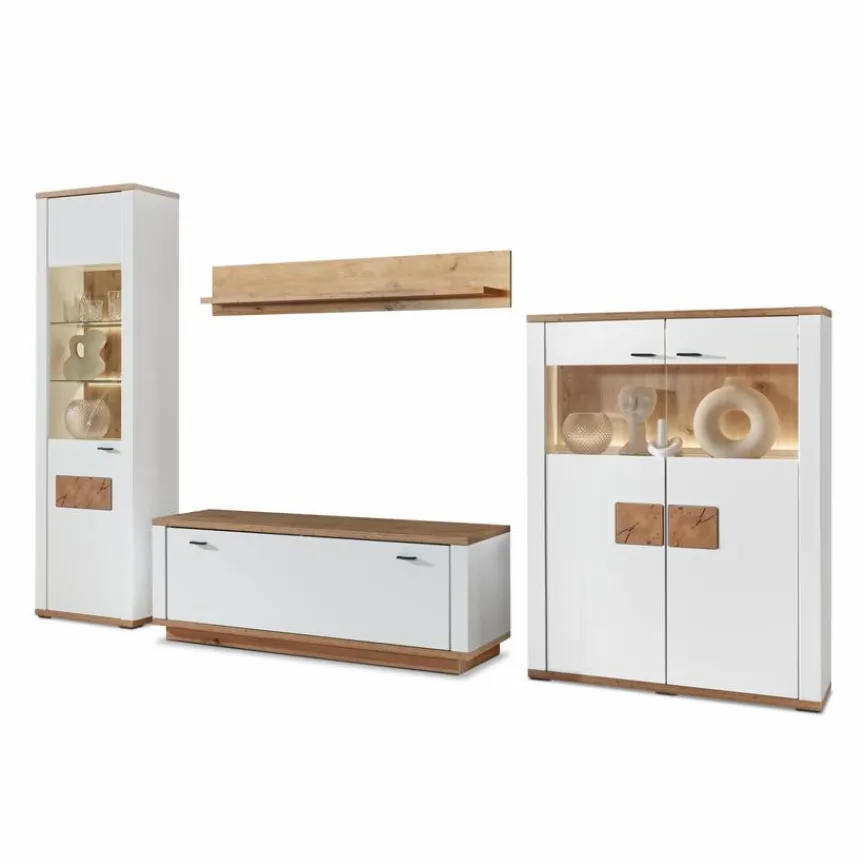 - Bestehend aus 1 Vitrine, 1 2-türige Vitrine, 1 Lowboard und 1 Wandboard