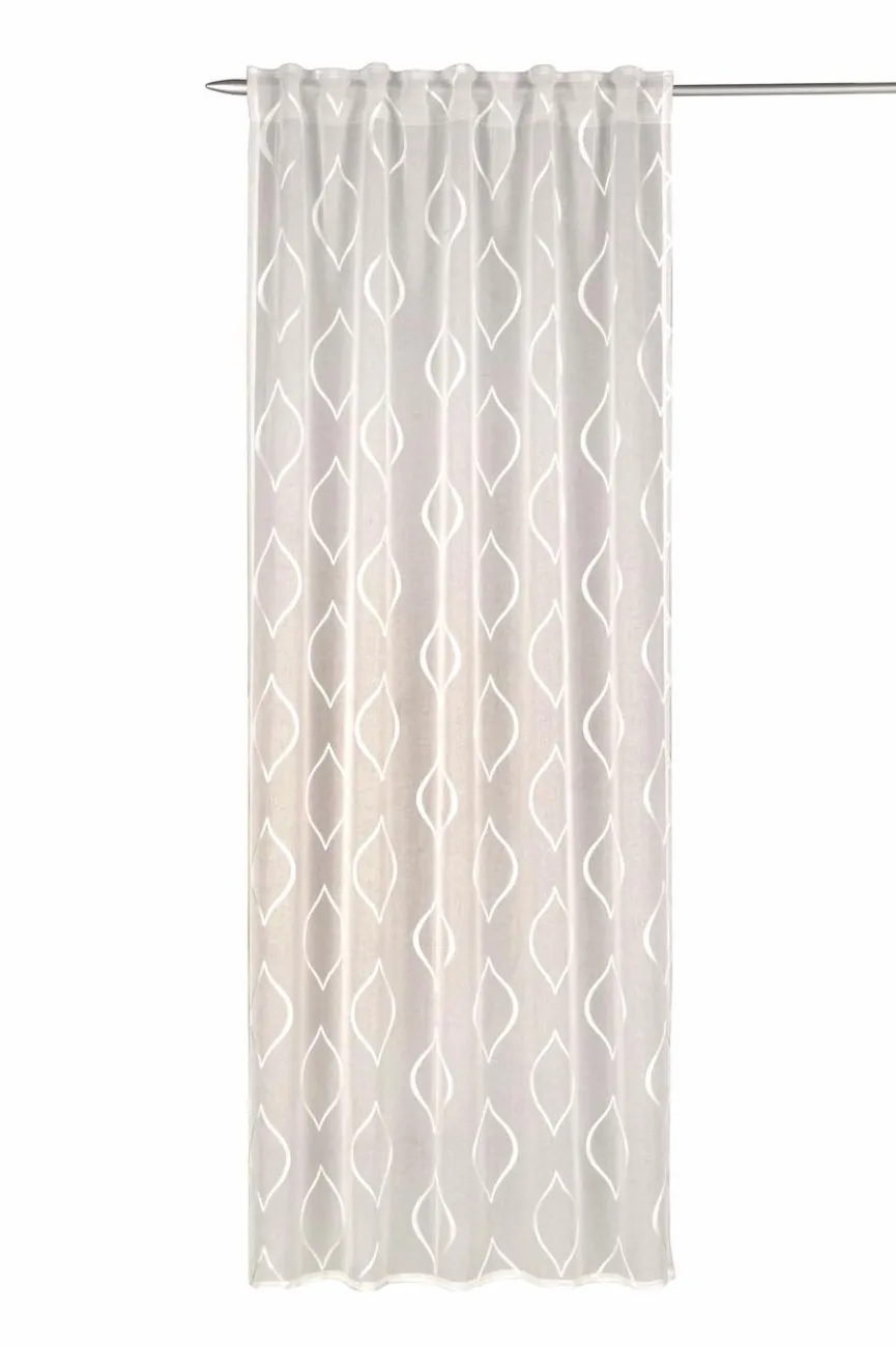 Die bodenlange Fertiggardine Liva 135×245 cm von Collection Noblesse zeigt spitz zulaufende Ellipsenformen als elegantes Muster. Sie wird direkt auf die Gardinenstange gefädelt und erspart damit einigen Zeitaufwand beim Aufhängen und Abnehmen. Für hohe Fenster und Glasfronten ist die Fertiggardine Liva 135×245 cm wie geschaffen, auch Terrassen- und Balkontüren erhalten eine wundervolle dekorative Umrahmung.