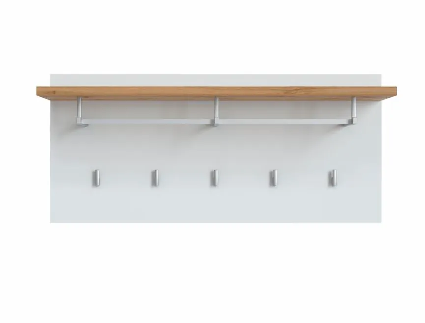 Das Garderobenpaneel Hola bietet der Familie und Ihren Gästen praktische Möglichkeiten, um Kleidungsstücke sicher zu verwahren. Zu diesem Zweck hält das Dielenpaneel fünf Haken, eine Kleiderstange und eine Ablage bereit. Außerdem überzeugt das Garderobenpaneel Hola durch den zeitgemäßen Holzlook und die hochglänzende Farbe.
