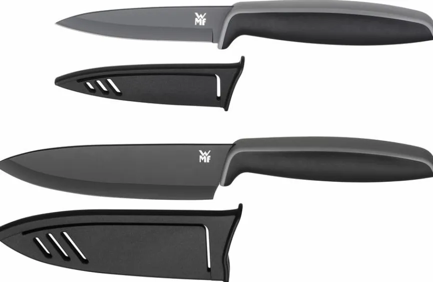 - Artikel beinhaltet je 1x Allzweckmesser (L 20 cm, Klingenlänge 9 cm) und Kochmesser (L 24 cm, Klingenlänge 13 cm); jeweils mit Klingenschutz