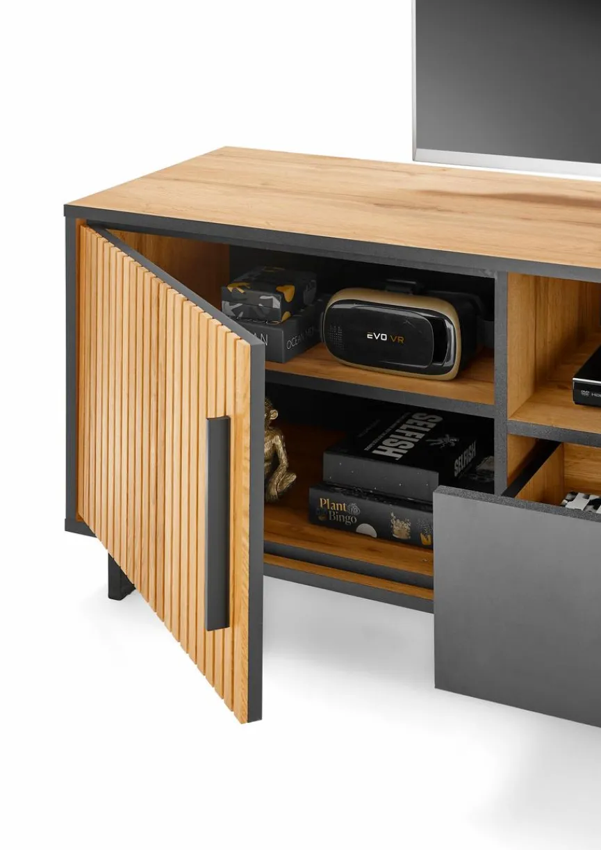 - Korpus aus Holzwerkstoff (Spanplatte) mit hochwertiger Dekorfolie in Eiche Nachbildung, Front aus massiver Eiche mit Akustikpaneel auf Spanplatte foliert, Rahmen/Absetzung und Schubkasten aus Spanplatte mit kratzfester Melaminharzfolie in Schwarz