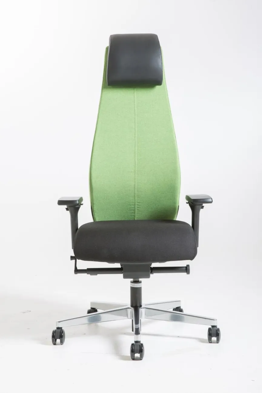 - Sitzbezug aus Stoff in schwarz, Rücken aus Stoff in grün, Kopfstütze aus Leder in schwarz, Fußkreuz aus Aluminium