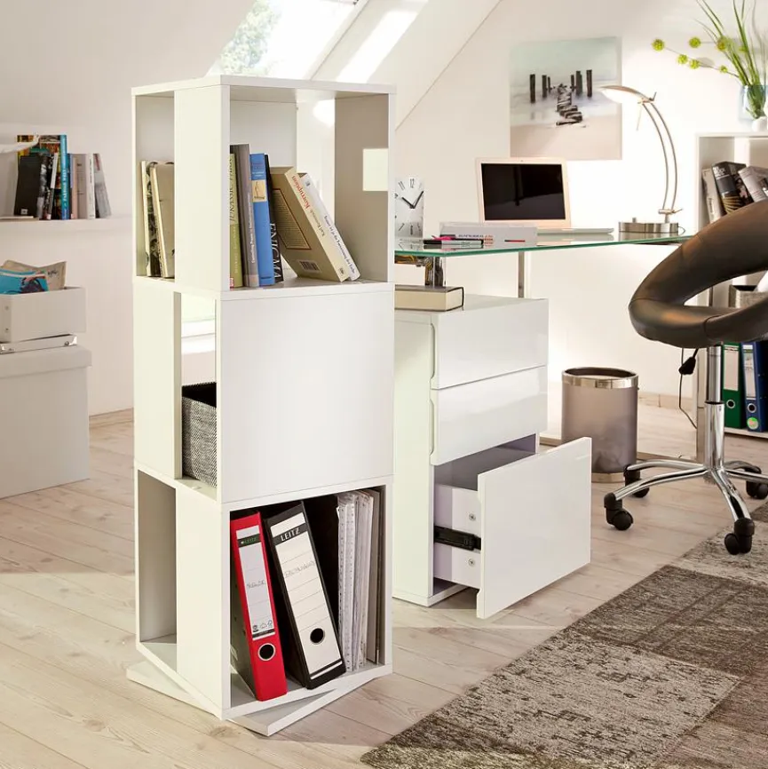 Beim Regal Toronto gehen klare Formensprache und hohe Funktionalität eine harmonische Verbindung ein, die aus einem praktischen Gebrauchsgegenstand ein modernes Möbelstück macht, das vielseitig einsetzbar ist. Besonders raffiniert: Das Regal ist auf einer Drehscheibe angebracht, so dass alle Unterlagen in den Fächern jederzeit griffbereit sind.
