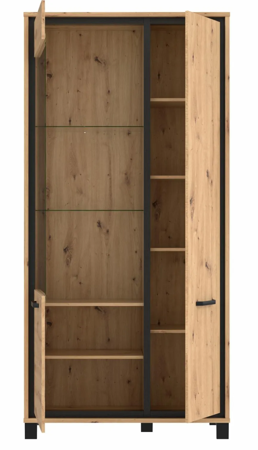 - Aus Holzwerkstoff (Spanplatte) mit hochwertiger Dekorfolie in Artisan Eiche, Absetzungen in Eiche schwarz
