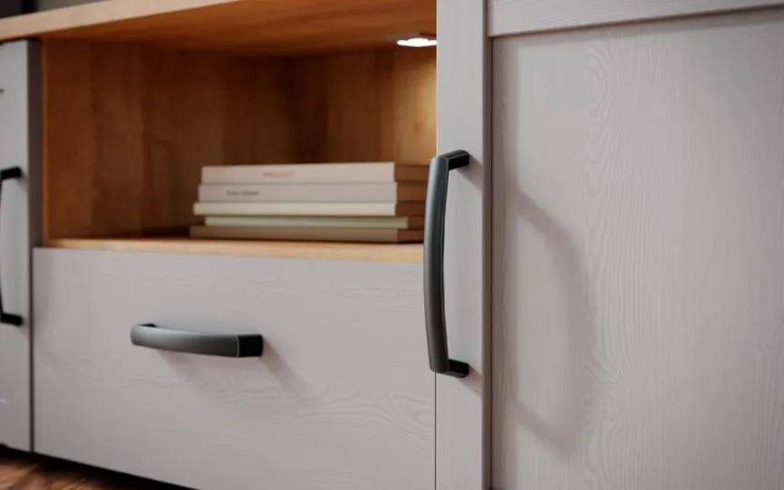 - Rückwand besteht aus Holzwerkstoff (HDF) in Eiche Grau, Korpus besteht aus Holzwerkstoff (Spanplatte) in Eiche Grau. Front besteht aus Holzwerkstoff (Spanplatte/MDF) in Eiche Grau. Absetzung in Riviera Eiche mit Kratzfester Melaminharzfolie