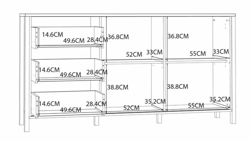 - Mit 1 Tür, 1 Schiebetür und 3 Schubkästen
