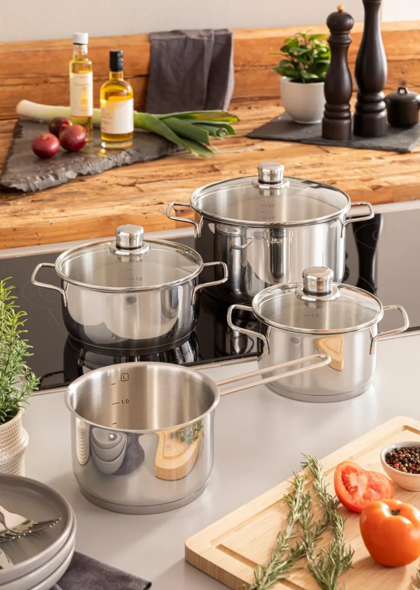 - Artikel beinhaltet je 1x Kochtopf Ø 16 cm, Ø 20 cm, Ø 24 cm, Bratentopf Ø 20 cm, jeweils mit Glasdeckel und Stielkasserolle Ø 16 cm ohne Deckel