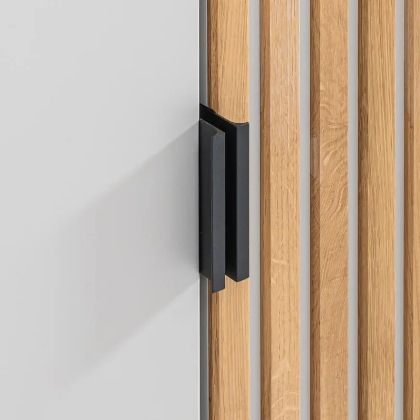 Der Garderobenschrank Madrid bietet mit seiner geschlossenen matten Seite und den Holzpaneelen auf der anderen Seite einzigartige Vielseitigkeit. Der robuste Metallstandrahmen des Dielenschranks sorgt für Stabilität und modernen Charme. Organisieren Sie Ihre Kleidung stilvoll und effizient mit diesem praktischen und ästhetischen Garderobenschrank Madrid.