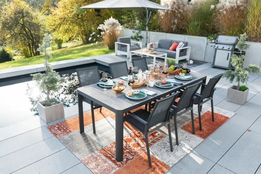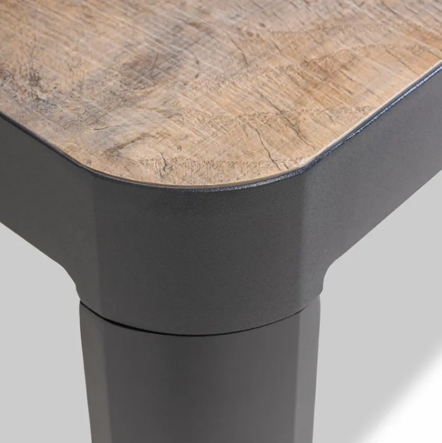 Der Gartentisch Luca, Aluminium wartet mit einer Überraschung auf: Von weitem wirkt er wie ein Tisch mit Holzplatte, doch bei genauerer Betrachtung fällt auf, dass es sich um Keramik in Holzoptik handelt. Hierdurch sowie durch das Aluminiumgestell hebt sich das Möbelstück von der Masse ab. Der Gartentisch Luca, Aluminium ist nicht nur ein besonderer Blickfang, sondern erweist sich zudem durch die Materialkombination als langlebig.