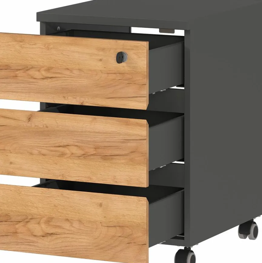 - Aus Holzwerkstoff (Spanplatte) mit kratzfester Melaminharzfolie in graphit, Schubkastenfronten in Eiche-Navarra-Nachbildung