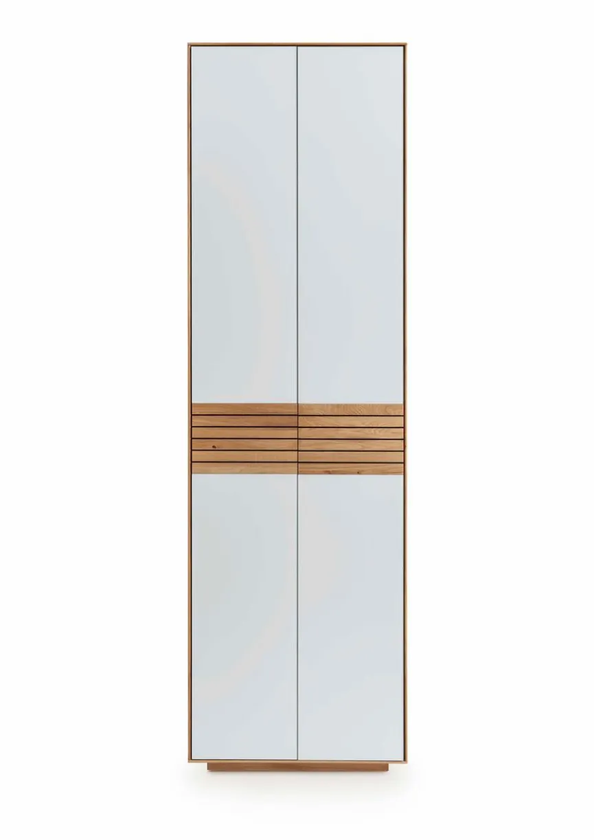 Für Übersichtlichkeit im Eingangsbereich sorgt der viel Stauraum bietende Garderobenschrank Riva von Gradel. Der schmale Dielenschrank ist mit zwei Türen ausgestattet, hinter denen sich sechs Einlegeböden und eine Hutablage verbergen. Bei Bedarf kann der Garderobenschrank Riva mit weiteren Möbeln der Serie kombiniert werden, sodass im Flur eine einheitliche Ästhetik entsteht.