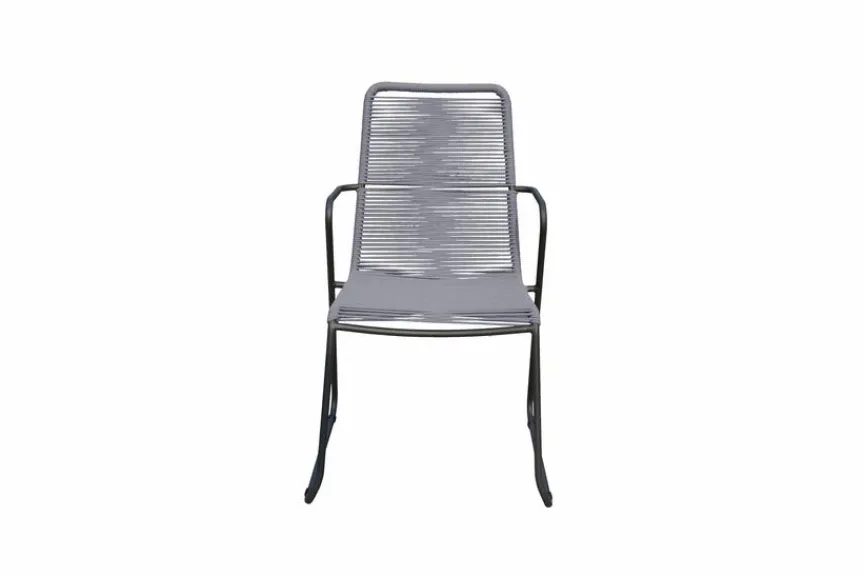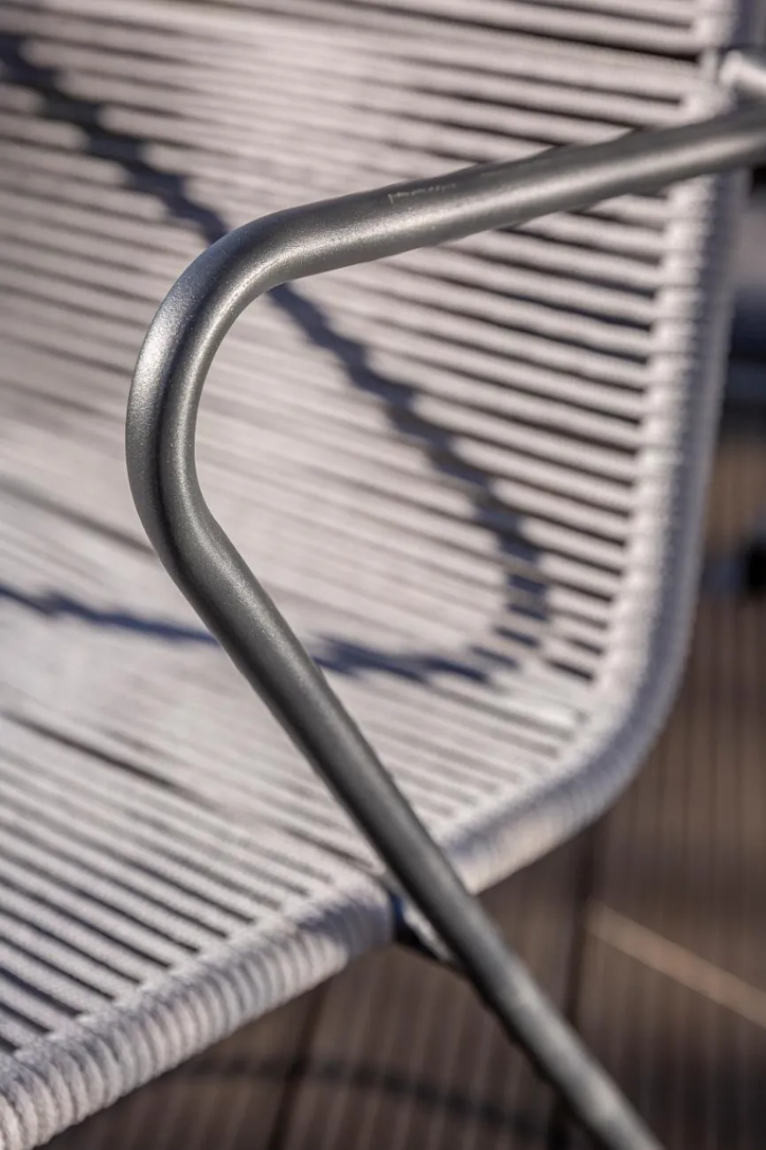 Moderner Kufen-Sessel in angesagtem Retro-Look. Filigranes Stahlgestell, sehr stabil, leicht und platzsparend stapelbar. Die Sitzfläche ist im angesagten Rope Style bespannt und egal ob dezent oder farbenfroh, die 4 Farbvarianten können individuell kombiniert werden. Der passende Tisch ist mit einer Platte in Holzoptik aus pflegeleichtem Polywood versehen und rundet den Look ab. Wer es puristischer mag, für den bietet der Tisch mit einer Glas-Keramik-Platte in Natursteinoptik, aus der gleichen Serie, eine Alternative.