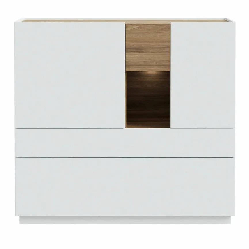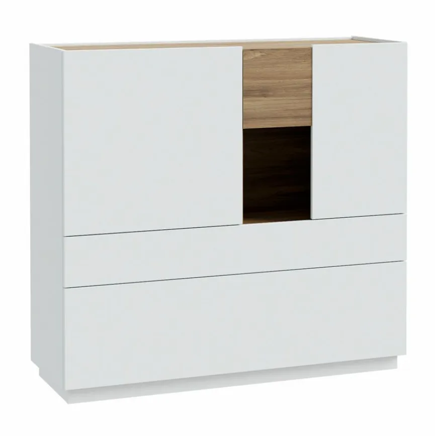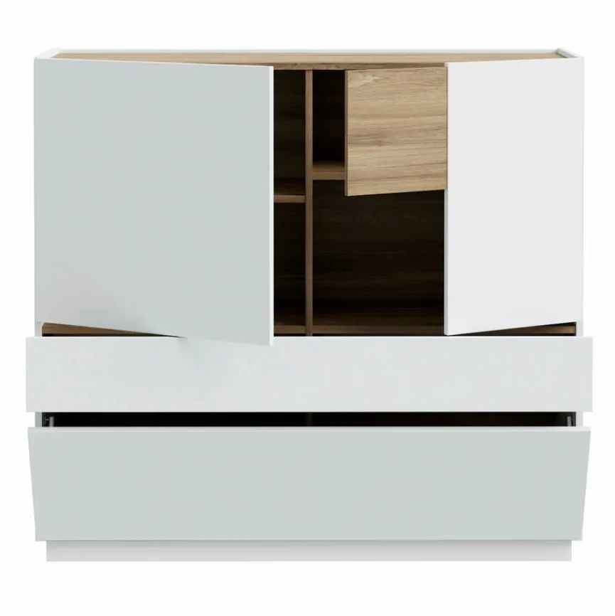 - Mit 2 Türen, 2 Schubkästen, 1 Klappe und 1 offenen Fach