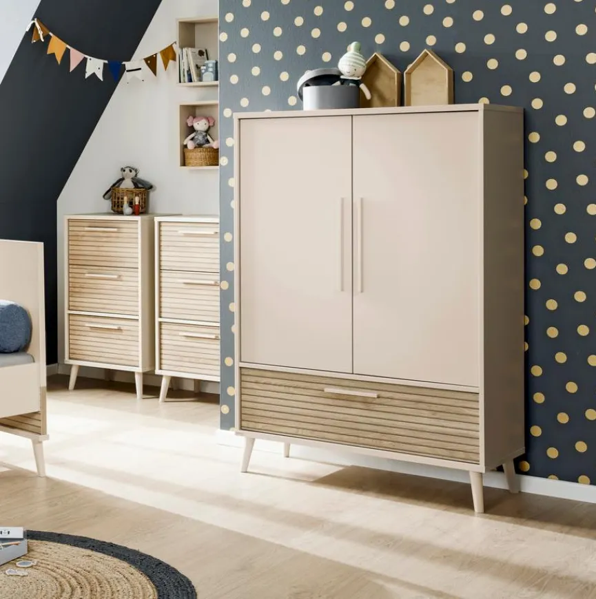 - Aus Spanplatte mit kratzfester Melaminharzfolie in Cashmere-Beige, Absetzung in Eiche Lamellenoptik, Füße und Griffe aus Kunststoff in Cashmere-Beige