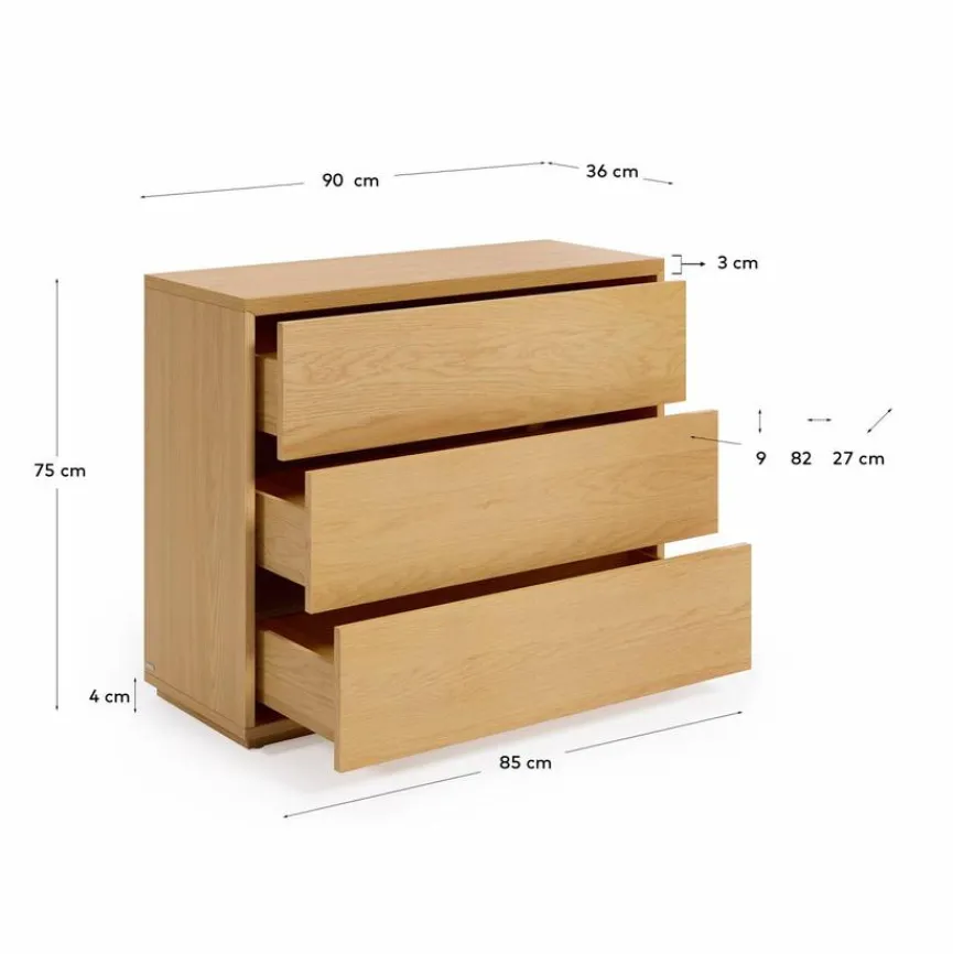 Damit alles stets seinen Platz findet, bietet die Kommode Abilen von Kave Home genügend Stauraum für viel Kleidung oder andere Utensilien. In drei ausreichend großen und tiefen Schubfächern wird Ordnung halten keine lästige Pflichtübung mehr, Sie werden Spaß am Aufräumen haben. Die Kommode Abilen passt gleichermaßen gut in Schlafzimmer, Eingangsbereich oder jeden anderen Raum – je nachdem, wo Sie es wünschen.