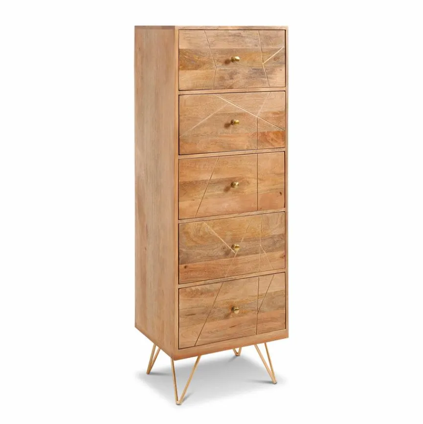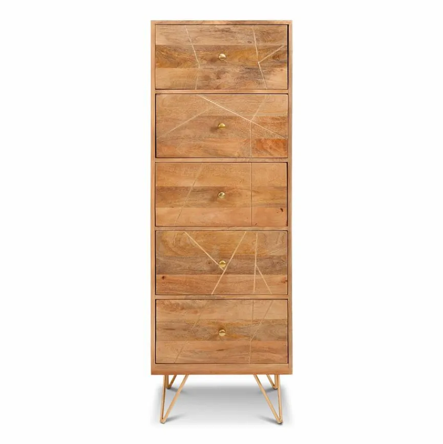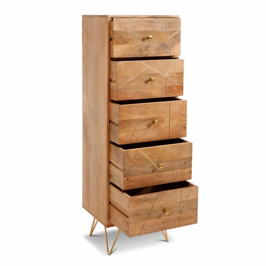 Mit der Kommode Scan entscheiden Sie sich für ein stilvolles und edles Möbelstück. Der geradlinige Korpus steht auf vier schlanken Füßen, die der Kommode Leichtigkeit verleihen. Die Front der Kommode Scan ist mit metallischen Einfräsungen versehen. Fünf Schubladen mit runden Knäufen bieten jede Menge Platz.