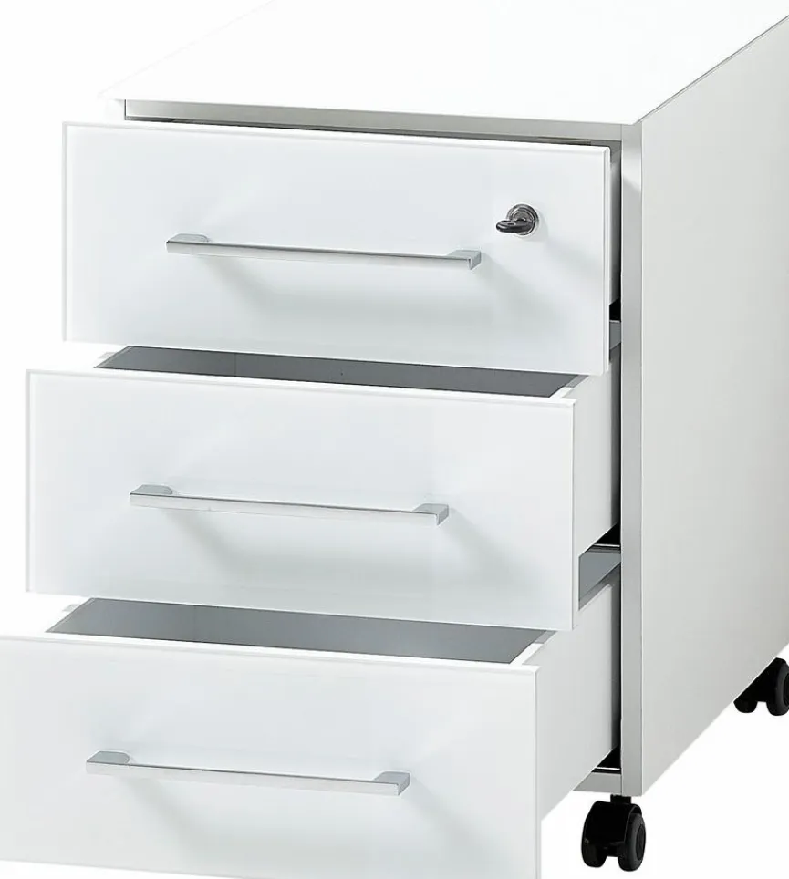 - Mit 3 Schukästen, oberer Schubkasten mit Schloss, inkl. 4 Rollen (2 davon feststellbar)