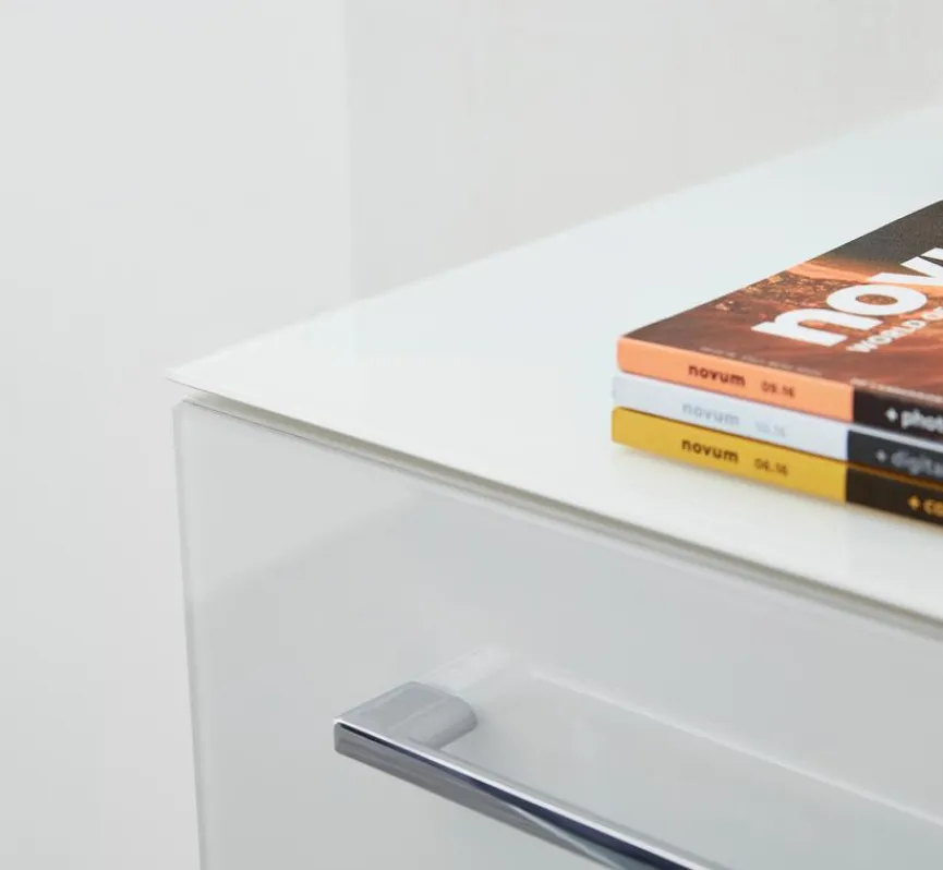 - Korpus aus Spanplatte mit kratzfester Melaminharzfolie in weiß, Deckplatte und Front mit Glasauflagen aus Sicherheitsglas in weiß