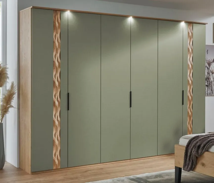 - Front in Lack grün mit Absetzung Balkeneiche massiv, Schrankkorpus aus Spanplatte furniert in Balkeneiche