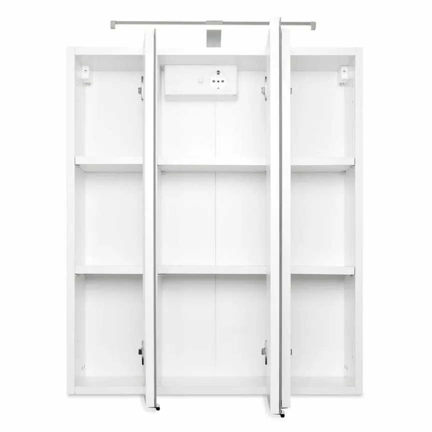 Der Spiegelschrank 039.1.0001 kann dank der sechs Holzeinlegeböden reichlich befüllt werden. Das Make-up und das kostbare Parfüm sind vor Staub und Wasserspritzern optimal geschützt. Die dazugehörige LED-Leuchte sorgt für eine ausreichende Helligkeit im Raum. Die Türen bei dem Spiegelschrank 039.1.0001 sind über kleine dezente Griffe zu öffnen. Zudem verfügt er über eine integrierte Steckdose im Inneren.