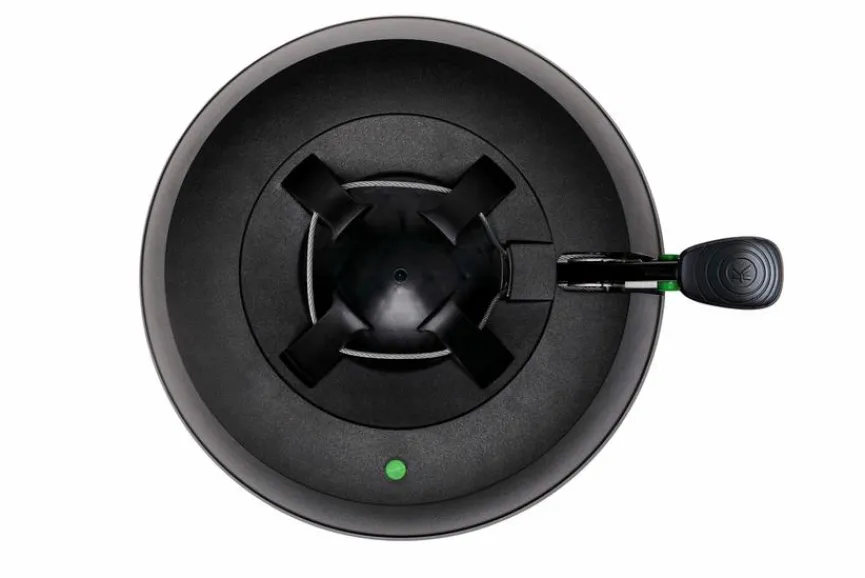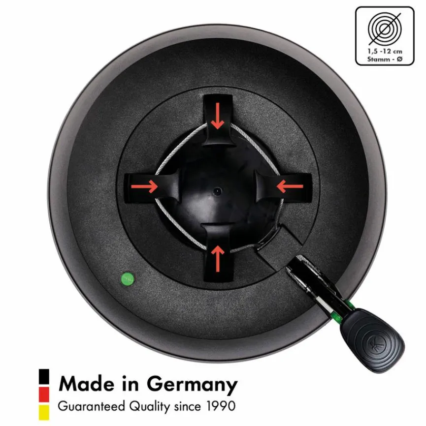 - Durchgehende Seilführung garantiert gleichmäßigen Druck der Klauen auf den Stamm. Baum in den Ständer stellen, Fußpedal treten; fertig!