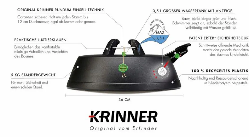- Mit Rundum-Einseil-Technik für Stammdurchmesser bis 11 cm; dadurch sicherer und kerzengerader Stand des Baumes; 3,5 Liter Wassertank