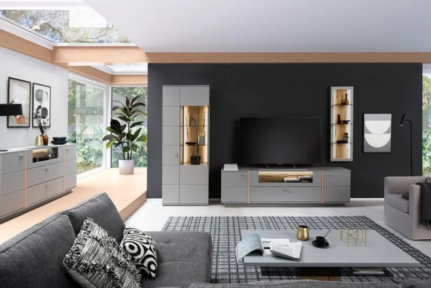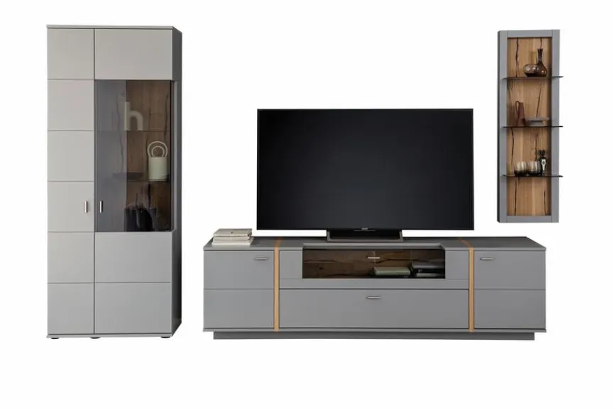 Dank ihres modernen, geradlinigen Designs wirkt die Wohnwand Sevilla ausgesprochen zeitgemäß und sehr attraktiv. Die Vitrine, das TV-Element und das Wandregal bieten Ihnen viel Platz für Unterhaltungselektronik, Medienzubehör, Bücher, Geschirr und dekorative Objekte. Mit der Wohnwand Sevilla erhalten Sie eine Möbelkombination, deren einzelne Komponenten ideal aufeinander abgestimmt und flexibel platzierbar sind.